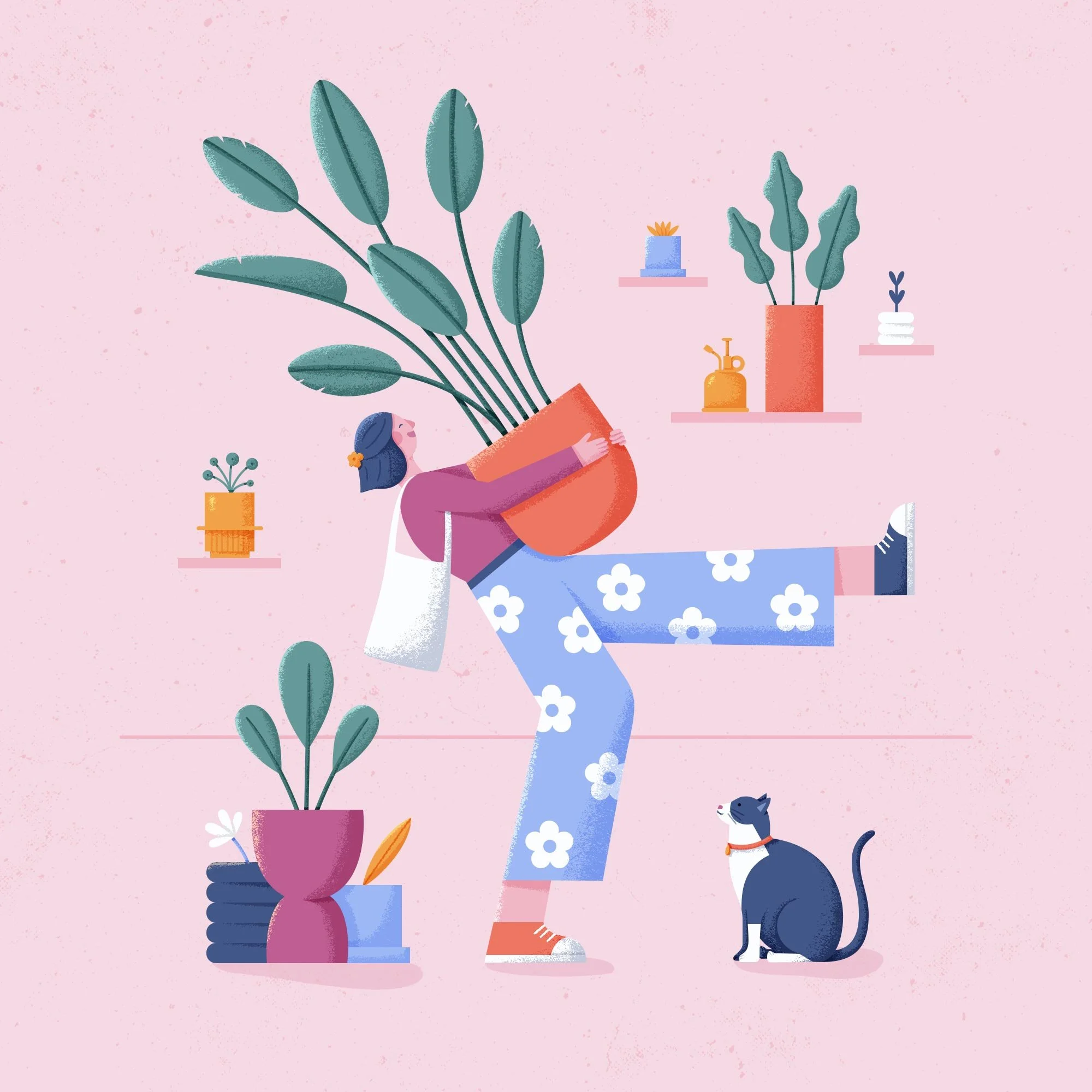 This project is a personal exploration of my love for plants and drawing. I created the Plants Lady Collection as a series of posters that showcase various plant and vase designs while experimenting with character proportions. Each illustration also features a cheerful cat, inspired by my own cat who loves to hang around the plants at home. I focused on using simplified shapes and compositions, maintaining a consistent and reduced color palette throughout the collection.